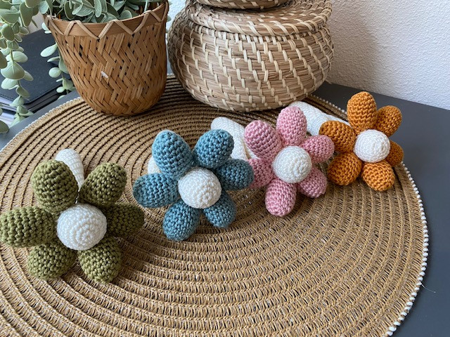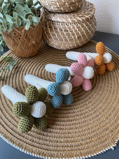 Ga aan de slag met het haakpatroon van deze schattige rammelaar. Deze bloemrammelaar wordt ca. 13cm maar mocht je ander garen gebruiken dan aangegeven dan zullen ze, afhankelijk van het garen dat je gebruikt, groter of kleiner worden. De rammelaar is gehaakt met Scheepjes Catona een 100 % katoen garen en haaknaald 2.5mm